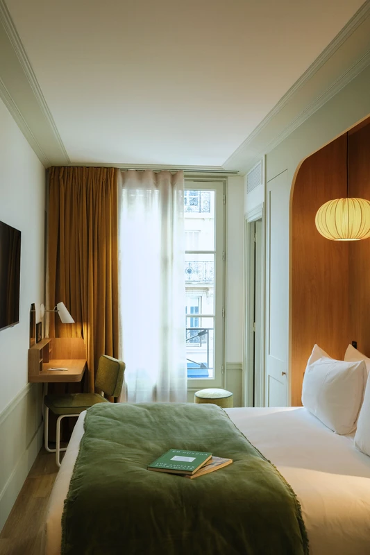 La chambre Tradition porte bien son nom : elle évoque l'élégance tranquille des pensions de famille d'antan, repensée avec soin. Son atmosphère douce et rassurante invite à se poser, à prendre le temps. On y trouve tout ce qu'il faut, sans rien de trop : un lit accueillant, une lumière tamisée, un confort enveloppant. Que l'on soit en voyage ou en escapade, elle offre une pause calme dans le rythme de la ville. Comme un clin d'œil à un Paris fidèle à lui-même.